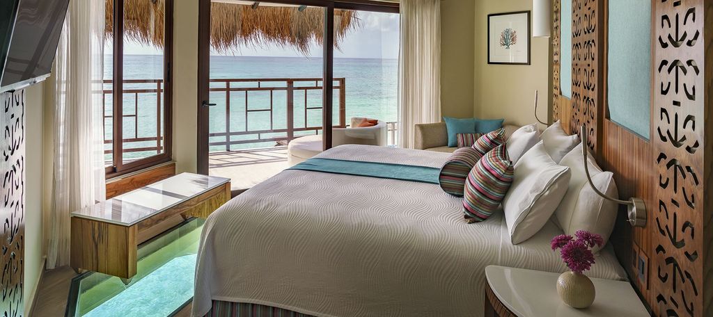 Palafitos-Overwater Bungalows are a cluster of 30 exclusive, private bungalows sitting right over the turquoise waters of Maroma Beach. Every single facet of these exclusive suites is designed to highlight the surrounding beauty.